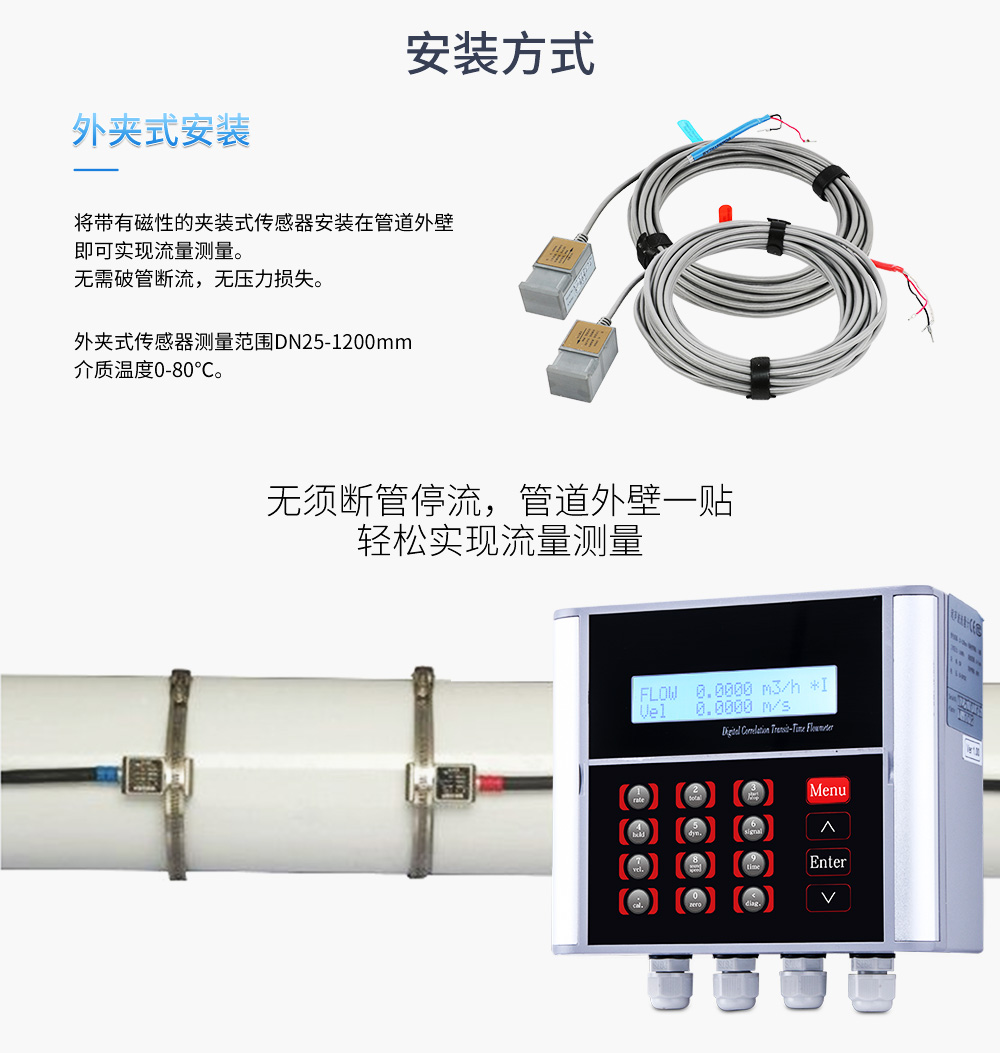 外夾式或者管段式超聲波流量儀表是以"速度差法"為原理,測量圓管內(nèi)液體流量的儀表。它采用了先進(jìn)的多脈沖技術(shù)、信號數(shù)字化處理技術(shù)及糾錯(cuò)技術(shù),使流量儀表更能適應(yīng)工業(yè)現(xiàn)場的環(huán)境,計(jì)量更方便、經(jīng)濟(jì)、準(zhǔn)確。產(chǎn)品達(dá)到國內(nèi)外先進(jìn)水平,可廣泛應(yīng)用于石油、化工、冶金、電力、給排水等領(lǐng)域。